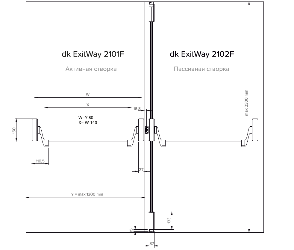 Комплект АНТИПАНИКИ dk tech ExitWay 2102F на двупольную дверь без притвора шириной до 1300 мм