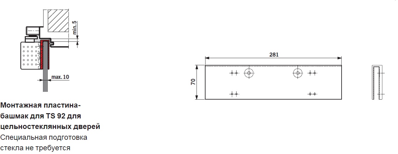 Монтажная пластина-башмак для TS 92 дляцельностеклянных дверей. Специальная подготовка стекла не требуется.