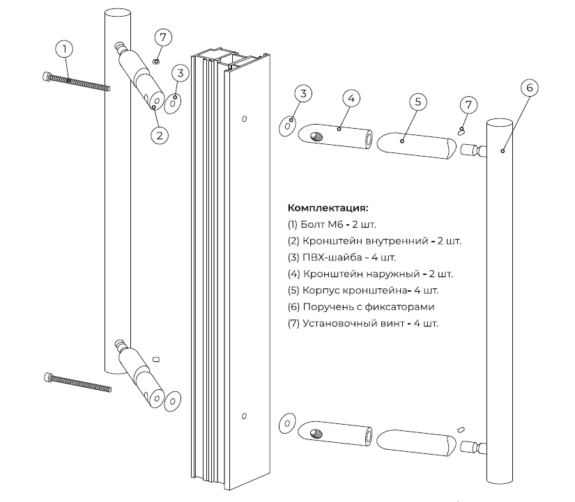 3. Вставить поручень с фиксаторами (6) в подготовленные на профиле кронштейны и закрепить установочным винтом (7) в технологическом отверстии.